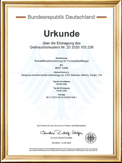 • 實(shí)用新型專利證書(一種甲醛清除劑的原料加載