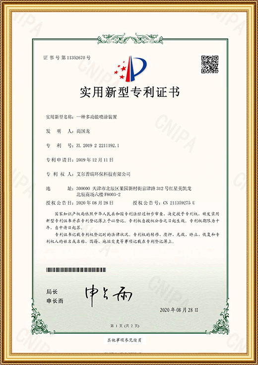• 實(shí)用新型專利證書(一種多功能噴涂裝置)