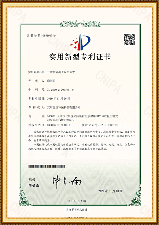 • 實(shí)用新型專利證書(一種負(fù)氧離子發(fā)生裝置)