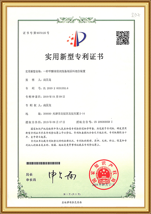 • 實(shí)用新型專利證書(一種甲醛清除劑的原料存儲(chǔ)